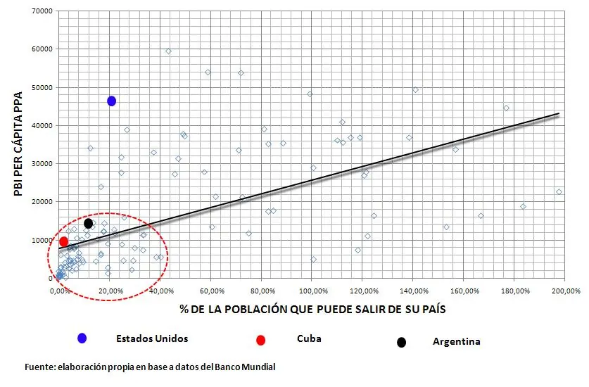 - Lo que dice el post es muy simple: usualmente se dice que en Cuba "hay una dictadura" y eso se "demuestra" a partir de que "no se puede salir". Esto es falso, y lo sabemos porque. A) el Banco Mundial admite que 200.000 cubanos viajan al exterior todos los años. B) el % de cubanos que viajan al exterior es similar al que tienen los paises con la misma riqueza que Cuba. C) por ende, si decimos que en Cuba hay una dictadura porque pocos pueden salir, por lógica, tenemos que decir que en todo el mundo hay una dictadura, porque esa situación es la misma en todas partes. Entonces, llegamos a la conclusión de que es absurdo medir la democracia de un país por cuánta gente viaja al exterior. Democracia es otra cosa.
