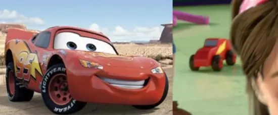 En otra de las escenas, se muestra la guardería, en dónde hay muchísimos juguetes, sin ven con detenimiento en la parte de atras, se vé un pequeño carrito rojo, éste es uno de los carros de la película Cars, también un éxito por parte de Pixar.
