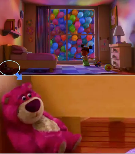 Lotso ya había hecho una aparición antes en una pelicula de Pixar, podemos ver a Lotso en un rincón del cuarto en “Up” en el momento justo cuando volabán en su casa con muchos globos ahí aparece lotso unos pequeños segundos.