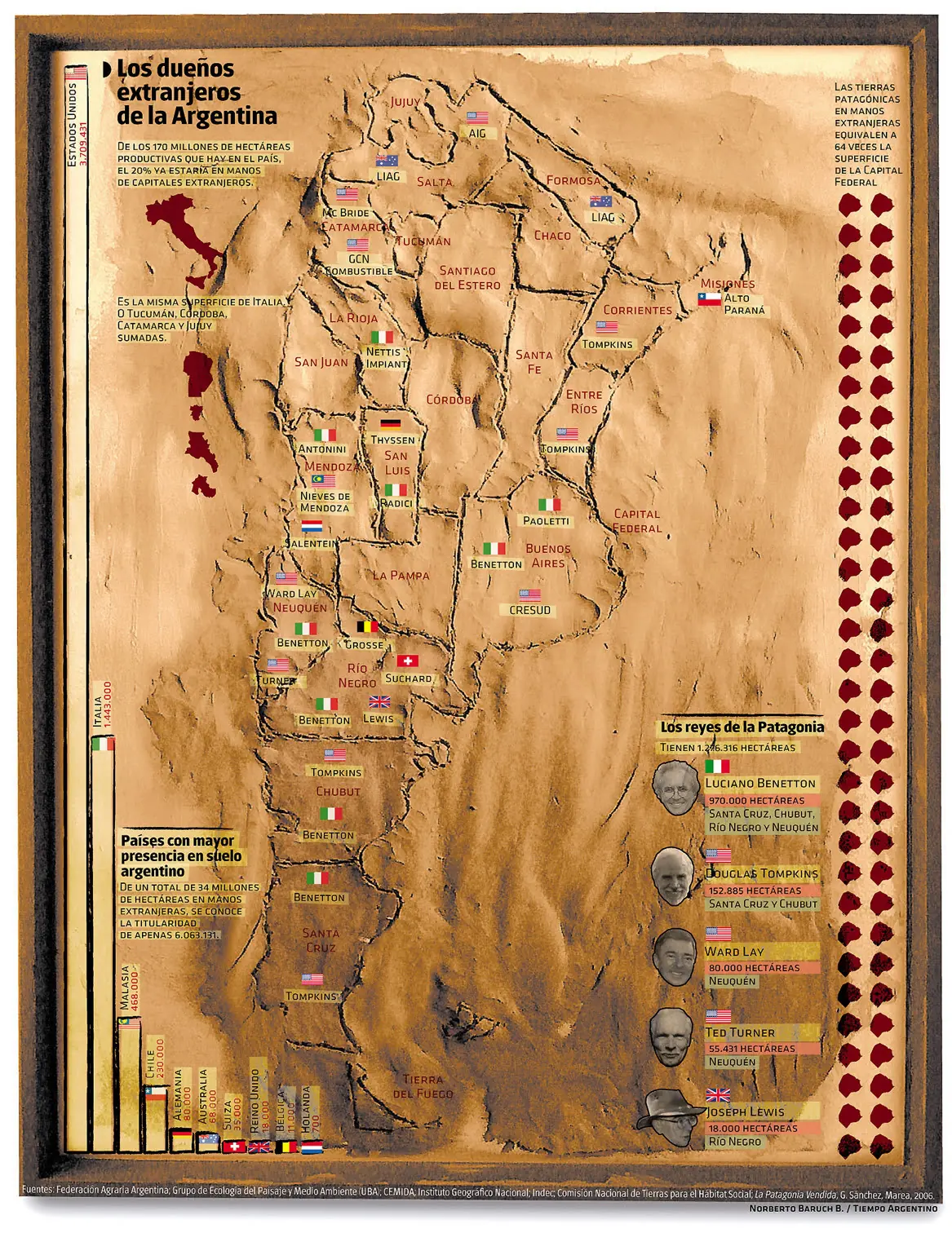 Unos 300 mil kilómetros cuadrados (el 10% del territorio nacional) están en manos de extranjeros, según la Federación Agraria Argentina. Esa cifra puede parecer mínima en relación con la superficie del país, que alcanza los 2.780.000 kilómetros cuadrados, pero equivale a más de la mitad de Francia. "Se puede comprar lo que quiera, en cualquier lugar, si se tiene el capital suficiente, incluso en los parques nacionales", asegura Gonzalo Sánchez, autor de "La Patagonia vendida", que entrevistó a la mayoría de los extranjeros que han comprado tierras en el sur.