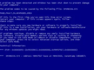 La BSOD (Blue Screen of Death) es la manera de informar un error crítico bajo los sistemas operativos Microsoft Windows. Las pantallas azules no son las culpables de nada; al contrario, son una gran ayuda para los usuarios o para el personal de soporte técnico. Muestran un detallado resumen del error, siendo de utilidad para solucionar la falla. Las causas de una BSOD pueden deberse a diversos factores: errores en archivos del sistema operativo, exceso de temperatura del procesador o northbridge, mala instalación de controladores de dispositivo, conflicto de recursos entre dos o más dispositivos, problemas en el disco duro, memoria RAM defectuosa, errores en el registro de Windows o placa de expansión defectuosa.