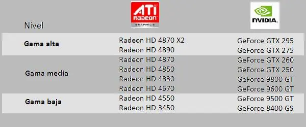 Los dos principales fabricantes de chips gráficos mantienen una durísima competencia y suelen tener en el mercado modelos de similar desempeño y precio, que, más o menos, se equiparan. Aunque nunca ofrecen exactamente el mismo rendimiento, puede decirse que hay un equilibrio. En la tabla siguiente podemos observar los principales modelos y sus contrapartes.