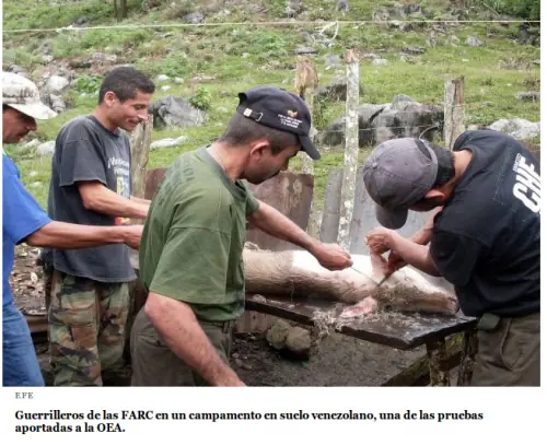 Nadie discutirá que basta una rápida mirada para comprobar que se trata de cuatro intrépidos y peligrosos guerrilleros, que cuentan con armamento sofisticado de última tecnología, que disponen de suministros alimentarios para soportar una dura guerra contra el ejército colombiano, y que el paraje donde han sido sorprendidos por el fotógrafo no permite albergar dudas de que es territorio venezolano. Comprobado todo esto, es lógico concluir que cuentan con la complicidad y ayuda del presidente venezolano Hugo Chávez.