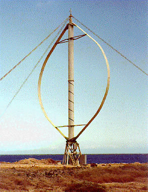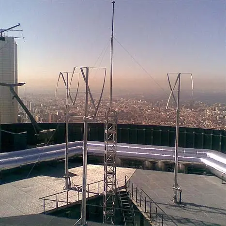 Aerogeneradores de eje vertical: Un ejemplo podría ser un aerogenerador para edificios con una potencia de 2,5 kW, 3 metros de altura y 2 metros de ancho. Se puede ajustar a 5 metros de alto en el techo de un edificio y su forma hace que puede utilizar los vientos procedentes de muchas direcciones.
