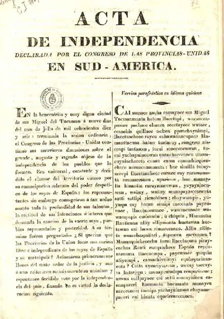 En la benemérita y muy digna Ciudad de San Miguel del Tucumán a nueve días del mes de julio de mil ochocientos dieciséis: terminada la sesión ordinaria, el Congreso de las Provincias Unidas continuó sus anteriores discusiones sobre el grande, augusto y sagrado, objeto de la independencia de los Pueblos que lo forman. Era universal, constante y decidido el clamor del territorio entero por su emancipación solemne del poder despótico de los reyes de España; los Representantes sin embargo consagraron a tan arduo asunto toda la profundidad de sus talentos, la rectitud de sus intenciones e interés que demanda la sanción de la suerte suya, Pueblos representados y posteridad; a su término fueron preguntados: