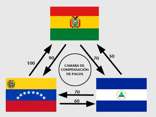 A través de la cámara de compensación, hay solamente una transferencia monetaria: Bolivia recibe 10 de Nicaragua.