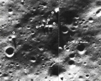 Al observar las fotografías realizadas por las primeras sondas lunares enviadas en los comienzos de la carrera espacial, entre ellas las fotografias del LUNAR ORBITER 3 (1966), hay una en la que se ve lo que puede ser una especie de construcción de dos kilómetros de altura, sumamente erosionada, a la que se denomina “SHARD”, a cuyo lado se encuentra un enorme cubo brillante flotando a unos once kilómetros de la superficie lunar.
