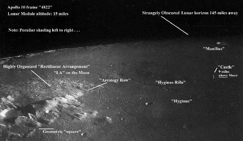 Pese a que Eugene Cernan y Thomas Stafford no llegaron a descender sobre nuestro satélite, sobrevolaron este en el modulo lunar, y cuando se encontraban a apenas 24 kilómetros de la superficie tomaron esa imagen, en la que observando atentamente se pueden encontrar una serie de detalles que no encajan con lo conocido sobre la Luna. En ella se ve una serie de alineaciones pétreas rectilíneas o formando un cuadrado y sobre todo, lo que parecen dos extraños reflejos de algo que está a varios kilómetros de altura.