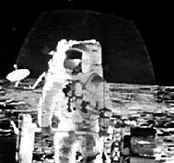 El astronauta Ed Mitchell del Apolo 14 , enfocan la cámara de televisión hacia Fra Mauro…..