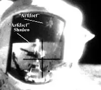 También se puede ver reflejado en el visor un objeto geométrico colgado ha cierta altura sobre la superficie lunar, el objeto parece estar sujeto por una estructura de forma circular formada por una especie de rejilla . También se puede apreciar la sombra formada por este objeto.