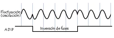 El formato DVD+R/DVD+RW usa un surco cuya oscilación posee una frecuencia mucho más alta que la de los DVD-R (817,4 kHz para DVD+R y 140,6 para DVD-R), y administra el direccionamiento mediante la modulación de la fase de oscilación, es decir, una especie de codificación de inversión de fase llamada ADIP (Direccionamiento en surco previo). Esta inversión de fase se produce cada 32 períodos (32T).