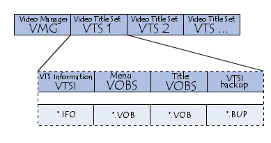 Los "títulos de video" pueden ser películas, videos o álbumes. Un título está formado por "Conjuntos de bloques de objetos de video" (VOBS) y cada uno de ellos contiene: