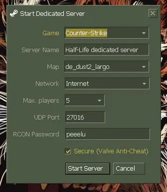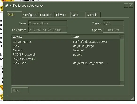 esos son los datos del srv, a tus amigos para que entren le vas a tener que pasar la direccion ip que figura ahi y en la solapa configurar, podes configurar algunas cositas tales como el freeztime, tiempo por ronda, la plata con la que queres arrancar, si quers poner el friendly fire o no, etc