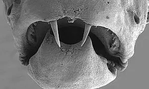 1. Danionella dracula. También conocido como "Pez Drácula" (en la imagen superior), fue descubierto en un riachuelo de Myanmar. Los machos de esta especie están armados con dos grandes colmillos que utilizan para luchar contra otros machos. Pueden abrir la boca hasta en un ángulo de 60 grados con respecto al eje del cuerpo, y sus dientes son los mayores de todos los peces de agua dulce.