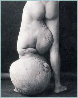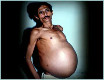 El hombre de la fotografía es Sanju Bhagat nacido en la India y de 36 años de edad. Su abultado vientre le confiere un aspecto de embarazado y en cierto modo es así pues dentro de él estaba creciendo su gemelo. El feto dentro de él estaba seriamente malformado y su supervivencia era imposible, a su vez ponía en peligro la vida de su huesped pues su crecimiento inusual dependía plenamente de su "hermano" completamente formado.