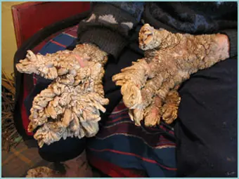 Enfermedad que provoca la aparición de verrugas de gran tamaño en todo el cuerpo, sus extremidades comienzan a cubrirse con verrugas que cada vez se hacían mas grandes, hasta que le hacen imposible actividades cotidianas como usar las manos y le dificultan enormemente el poder andar.