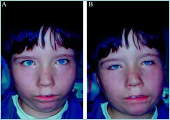 Los problemas en los ojos que se han observado, consisten principalmente en estrabismo y limitación del movimiento, pero afortunadamente, la ulceración de la cornea y otros hechos asociados con el pobre funcionamiento de los párpados, son raros. Los problemas dentales aparecen pronto y reflejan la incapacidad del niño para una apropiada auto-limpieza después de la comida y al estado entreabierto de la boca.