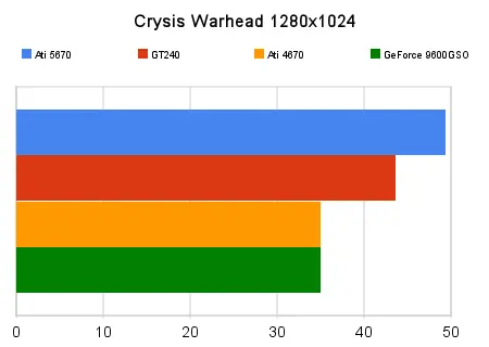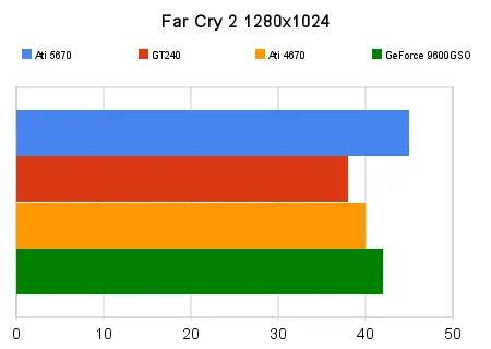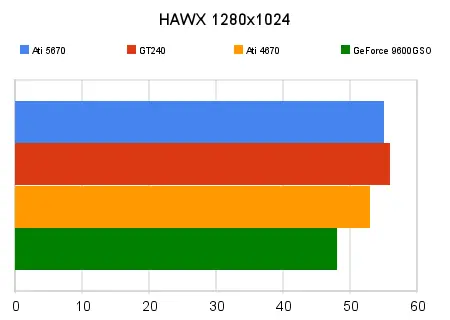 Aquí la cuestión es totalmente jugable, a resoluciones mayores llega a los 30fps pero eso está en el límite de lo aceptable, pero a 1280x1024, buena calidad, sin AA, el rendimiento es bueno aunque no una maravilla tampoco. La diferencia en mayores resoluciones es que la GT240 se queda atrás mientras la 5670 todavía es jugable.