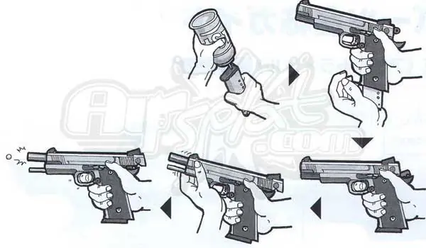 Los primeros y primigenios modelos de réplica, fueron pistolas, y los movimientos a realizar para alimentarlas de munición y hacer fuego, implicaban el tirar de la corredera y apretar el gatillo cada vez que se realizaba un disparo, siendo adaptadas a la operatividad real del arma copiada, estando los seguros aplicados en el mismo sentido y sus aletas tienen la misma forma, tamaño y situación. Las palancas de retenida actúan dejando abierta la pistola al agotar la "munición", repitiéndose de nuevo el ciclo de rellenar cargador (con entre 9 y 17 bolitas, dependiendo del modelo en cuestión), introduciendo éste, y volviendo a montar el arma. La acción de montar la corredera, forma parte del montaje de un pequeño pistón impulsor (bomba de aire) que oculta la réplica en su interior, al lado justo del comienzo del cañón.
