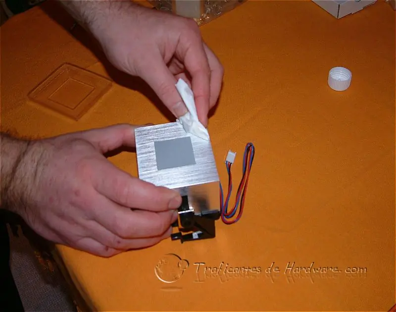 Volvemos a repetir que debemos aplicar una capa muy fina de pasta térmica, ya que su trabajo es transmitir el calor generado por el procesador de la manera más rápida posible al disipador de cpu. Una vez hayamos acabo, debemos colocar el cooler, pero antes debemos limpiar su base, ya que tendrá restos de la vieja pasta térmica. Al igual que antes, empaparemos un tozo de papel de cocina en alcohol, y limpiaremos la base del cooler.