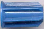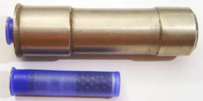 Extraño cartucho para engrase de armas. Formado por una corta pieza (35.94 mm de longitud total) de plástico azul acanalado, suponemos que al dispararse extiende una capa de grasa por el interior del cañón.