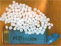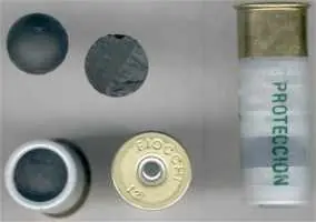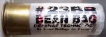 Otro cartucho para uso policial. Este lleva dentro del contenedor blanco un saquete relleno de perdigones. Al impactar el saco no se rompe. Su función es transferir toda la energia del disparo pero evitando penetrar en el cuerpo. El resultado es parecido al de una bola de goma pero más simple de utilizar.