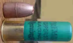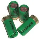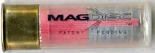 Cartucho \"Mag Disc\". En lugar de perdigones, dispara discos de plomo (se distinguen claramente a través del cuerpo transparente del cartucho). En el cine, este tipo de cargas con monedas en lugar de discos de plomo se usan para derribar puertas y para incrementar la letalidad a cortas distancias.