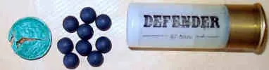 Cartucho de defensa policial \"Defender\" fabricado por Eley y conteniendo nueve grandes postas de goma.