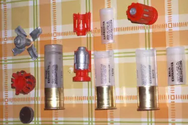 Cartucho con bala expansiva de la leridana Saga. Consta de una bala de plomo en forma de seta, envuelta con cuatro piezas que al ensamblarse con la central forman un cilindro. Todo el conjunto, subcalibrado, está contenido en una \"jaula\" de plástico rojo que no se pierde en vuelo. Sólo tras el impacto se deforma la jaula y su contenido se convierte en cinco grandes balas con un total de 28 gramos (1 Onza). De izquierda a derecha una bala recuperada sobre su jaula, su taco y su vaina disparada, una con el taco cortado para mostrar su disposición interna y otra completa junto a sus cartuchos seccionados.