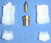 Cartucho aliviapercutores o aliviaagujas. Un simple trozo de plástico transparente con forma de cartucho que en lugar de pistón lleva una pieza cargada con un fuerte muelle. Permite practicar en casa el movimiento de disparo, pero sin los perjuicios que representa para la aguja percutora no detenerse contra el pistón. En la boca lleva marcado \"MADE IN ITALY BREV.\" y restos de alguna inscripción serigrafiada en el cuerpo.