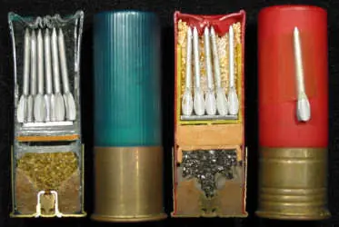 Corte de varios cartuchos del calibre 12. A la izquierda uno de perdigones, el resto con bala (Slug). Se aprecian las balas macizas con alerones que las harán girar por efecto aerodinámico.
