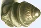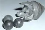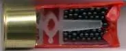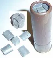 Cartucho cargado con postas no esféricas: Cinco grandes piezas de plomo que al ensamblarse forman un cilindro. Fabricado por E.R.T. (Marcaje igual al DQ0006).