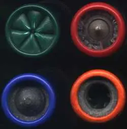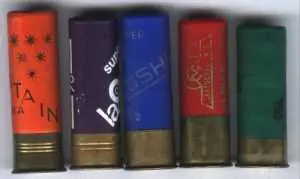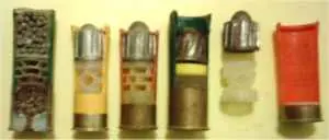A la izquierda, varias formas de cerrar el cartucho según el proyectil: en estrella para todos los de perdigones y alguno de bala (plástico verde), patente M.G. (bala maciza con tapa plástica transparente, cuerpo rojo), bala maciza sujeta por doblez en el cuerpo (azul), y bala hueca con estrías internas y cierre por enrrollamiento del cuerpo de cartón (naranja).