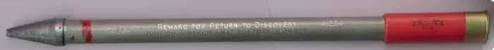 Cartucho para marcar ballenas con fines de investigación. La flecha tiene punta de plomo de 40 x 18.5 mm y un cuerpo de aluminio de 273 x 15.75mm con las indicaciones pertinentes. La vaina es normal del calibre 12, pero sin perdigones. Marcaje de FIOCCHI idéntico al DQ0007.