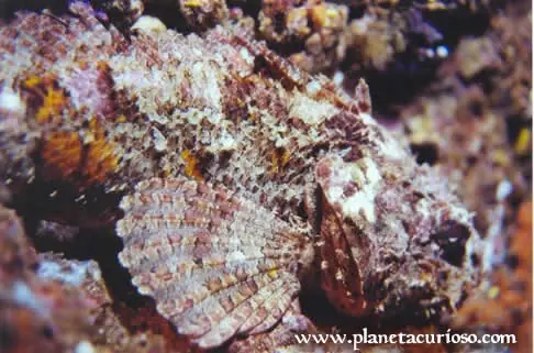 3. Pez piedra: Este es el pez más venenoso de la tierra. Tiene púas en la aleta dorsal, cada púa con una glándula venenosa. Su apariencia de roca puede ser muy peligrosa, ya que el bañista corre el riesgo de pisarlo y envenenarse. Tiene un veneno extremadamente peligroso y, normalmente, la víctima no logra sobrevivir. Si sobrevive, la herida dura varios meses en curarse.