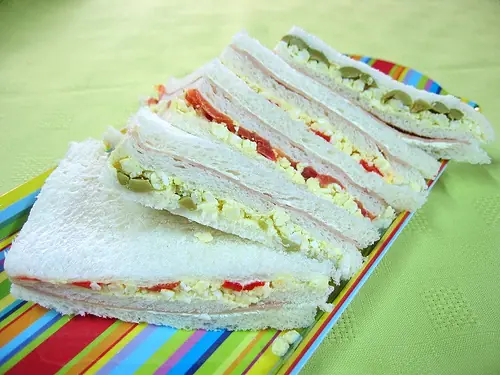 A parte de presentar los sándwiches en la forma tradicional, en triángulos, cuadrados y rectángulos sobre una fuente o plato, también existen otras posibilidades. Por ejemplo, si se va a servir a niños, le sugerimos que componga una casita colocando dos pilas juntas de sándwiches rectangulares cubiertos con algunos de forma triangular colocados encima, a modo de tejado. Con un poco de mantequilla blanda puesta en la manga pastelera podrá dibujar las ventanas o las puertas de la casita.