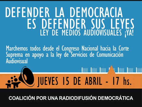 Boletín quincenal Nº 118.-El próximo 15 de abril, a partir de las 17 hs. la Coalición por la Radiodifusión Democrática se movilizará desde el Congreso a la Corte Suprema para reclamar que se rechace la suspensión de la Ley de Servicios Audiovisuales dispuesta por la Cámara Federal de la provincia de Mendoza. A continuación reproducimos la convocatoria de la Plataforma promotora de los 21 puntos por el derecho a la comunicación.