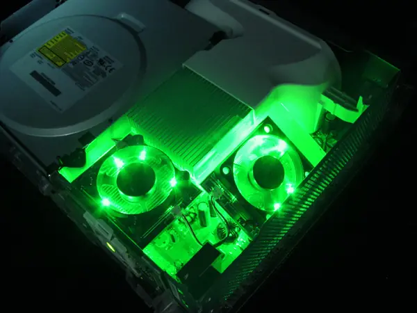 El núcleo del enfriador v2 LED verde Caso mod para Xbox 360 viene con dos ventiladores para refrescar el juego de consola. Este Mod de carcaza se puede utilizar en todas las consolas, incluso las que vienen con construido en el disipador de calor. En él se ofrece una atractiva solución de refrigeración para la Xbox 360 y aumenta la vida de sus consolas de juegos de azar por el cuidado de los más calor que produce.