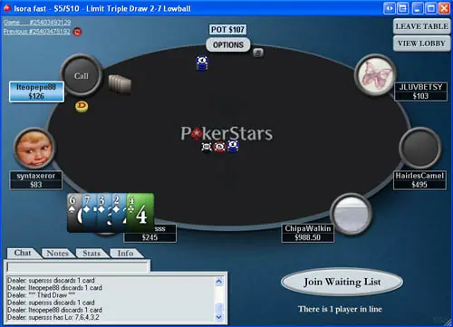 Aqui tienes que juntar la carta mas baja Aqui el as es alta. Por lo cual la mejor mano es 2-3-4-5-7 tal como dice el titulo. Hay una chance de descartar. Primero ronda de apuestas con las 5 cartas en mano y despues se descarta.