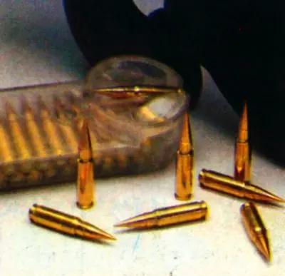 La munición de la P-90 (calibre 5,7 x 28 mm) junto a un cargador que muestra cómo giran en la rampa para poder entrar a la recámara.