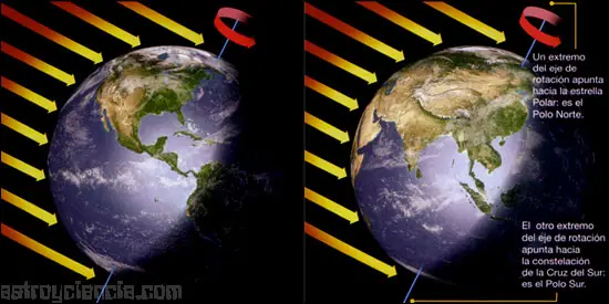 La Tierra como los demás planetas, gira sobre si eje imaginario. Debido a este movimiento de rotación el Sol ilumina una parte del planeta (el día), mientras otra permanece a oscuras (la noche). A la duración de una vuelta completa sobre el eje de rotación también se la llama día, y varia en los distintos planetas. Por ejemplo, mientras el día en la Tierra dura aproximadamente 24 horas, en Júpiter duca casi 10 horas.