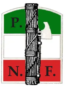 El fasces romano era el emblema del Partito Nacionale Fascista. En este emblema, sobre la bandera y con las siglas.