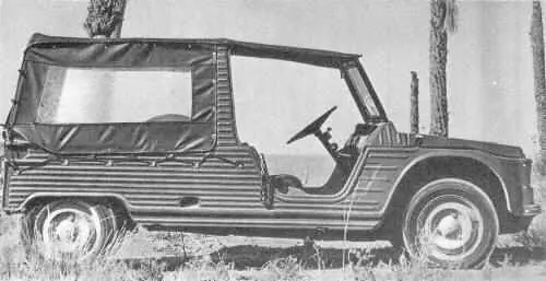 Cómo con bastante poco se puede hacer algo absolutamente distinto lo demostró la casa francesa cuando puso en marcha los primeros movimientos para el proyecto Mehari. Un auto totalmente nuevo, con una carrocería plástica que sirve, en primer lugar, para ocultar una plataforma igual a la del 3 CV. La mismísima plataforma-chasis de acero, la mismísima suspensión por interacción con las cuatro ruedas independientes, en cada una de ellas un amortiguador hidráulico y un batidor de inercia en las delanteras. La semejanza no termina allí, sino que se prolonga hasta el motor: bajo el capot de plástico empuja con su modestia y probada efectividad el bicilíndrico que hasta el Mehari equipaba exclusivamente al 3 CV. Lo irrompible, la tracción delantera, la sencillez y las características generales del motor lo hacen más que adecuado para un vehículo "todo terreno". Los 602 cm¿ (74 x 70) con camisas 'intercambiables, les culatas hemisféricas, las válvulas a la cabeza y el elemental carburador Solex crean una, potencia de 32 CV que cumple holgadamente la función de llevar el vehículo por cualquier piso a velocidades satisfactorias.