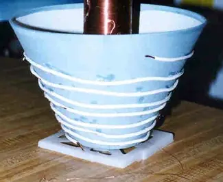 Se usa parte de una lámpara de mesa colocada al revés y se envuelve sobre ésta un alambre de cobre recubierto de plástico. Se san 8 metrso de alambre de cobre No. 12 o 14 enrrollado tal como se ev en la foto.