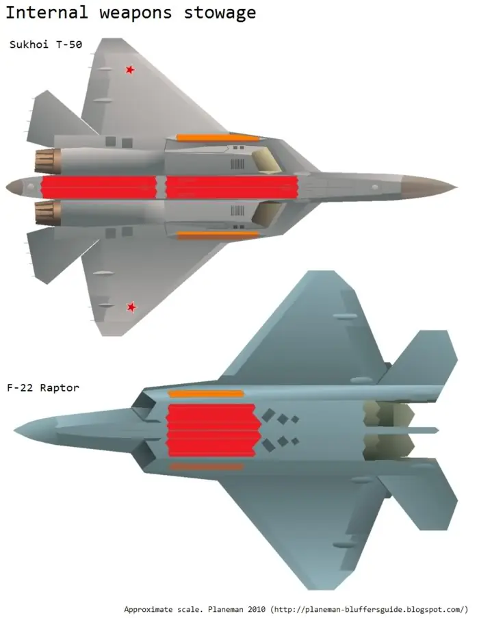 Esa comparación con el F-22 muestra que la bahía de arma principal del PAK-FA es más grande. El F-22 puede llevar 6 misiles AMRAAM en la bahía principal. Los informes indican que el PAK-FA puede llevar 8 AA equivalente-12 (RVV-SD), dándole una ventaja de 2 misiles. Los tramos laterales son de capacidad similar en los dos aviones con un solo misil de corto alcance por bahía. El PAK-FA es probablemente capaz de disparar por la parte trasera un RVV-MD , una característica única, en la cual el misil invierte el vuelo inmediatamente después de su lanzamiento. Los AA-12 con esta característica han sido probados y son posiblemente operativos dentro de los Flanker.