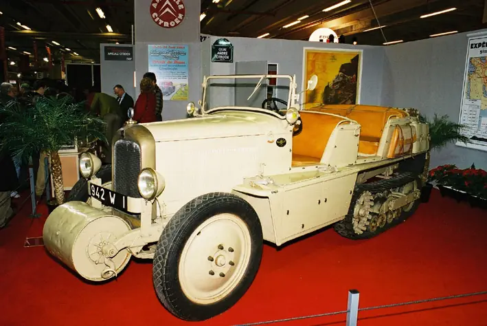 Los coches que se emplearon fueron los Citroen B2 10 HP, pero con una carrocería especial: dos plazas delanteras, una central y un armazón trapezoide para utensilios, provisiones, piezas… Y, sobre todo, con una oruga en la parte posterior, similar a la de los tanques, aunque construida en caucho.