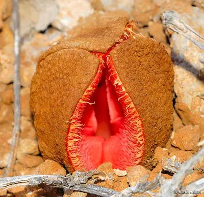 es una flor de un insólito color carne, que ataca las raíces sobresalientes de los arbustos en los áridos desiertos del Sur de Africa. El pútrido olor de su flor, atrae a las manadas de escarabajos carroñeros