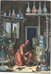 Un alquimista, posiblemente Irenaeus Philalethes, en su laboratorio. de Pyrotechnia ofte Vuur-stook-Kunde, Amsterdam, 1687.