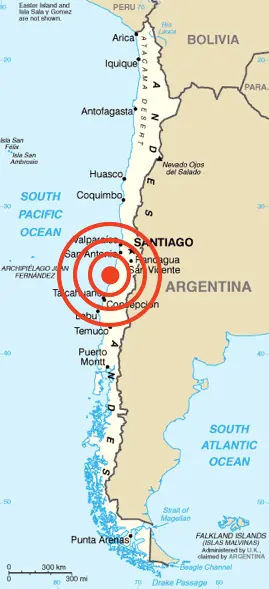 El epicentro sucedió en la costa de la Región del Bio Bío, aproximadamente 90 kilómetros al noroeste de Concepción, Chile. El sísmo ocurrió a las 3:34 AM hora local, y Santiago fue estremecida por más de minuto y medio, según se reportó. El terromoto también se sintió en partes de Argentina, entre ellas Buenos Aires.