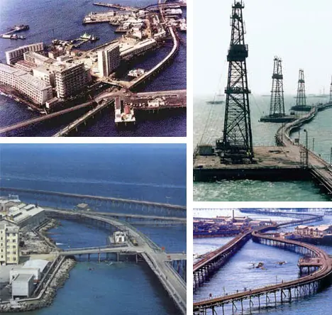 Ciudad abandonada del mar: En 1949 el mundo cambió por siempre mientras que el aceite fue pegado por primera vez en el mar de la costa de Azerbaijan. Después de poco tiempo la primera plataforma petrolera fue construida alrededor de este sitio pero ése no era todo: los dormitorios, las escuelas, los almacenes y otras estructuras todos fueron aumentados alrededor de este aparejo que formaba una ciudad virtual en el agua. Las naves fueron puestas en evidencia y hundidas para formar la base de una serie de islas artificiales. Conectado por una red de puentes y de otro estructura esta comunidad ahora ha disminuido y es todos sino abandonado con los edificios que caen nuevamente dentro del mar.